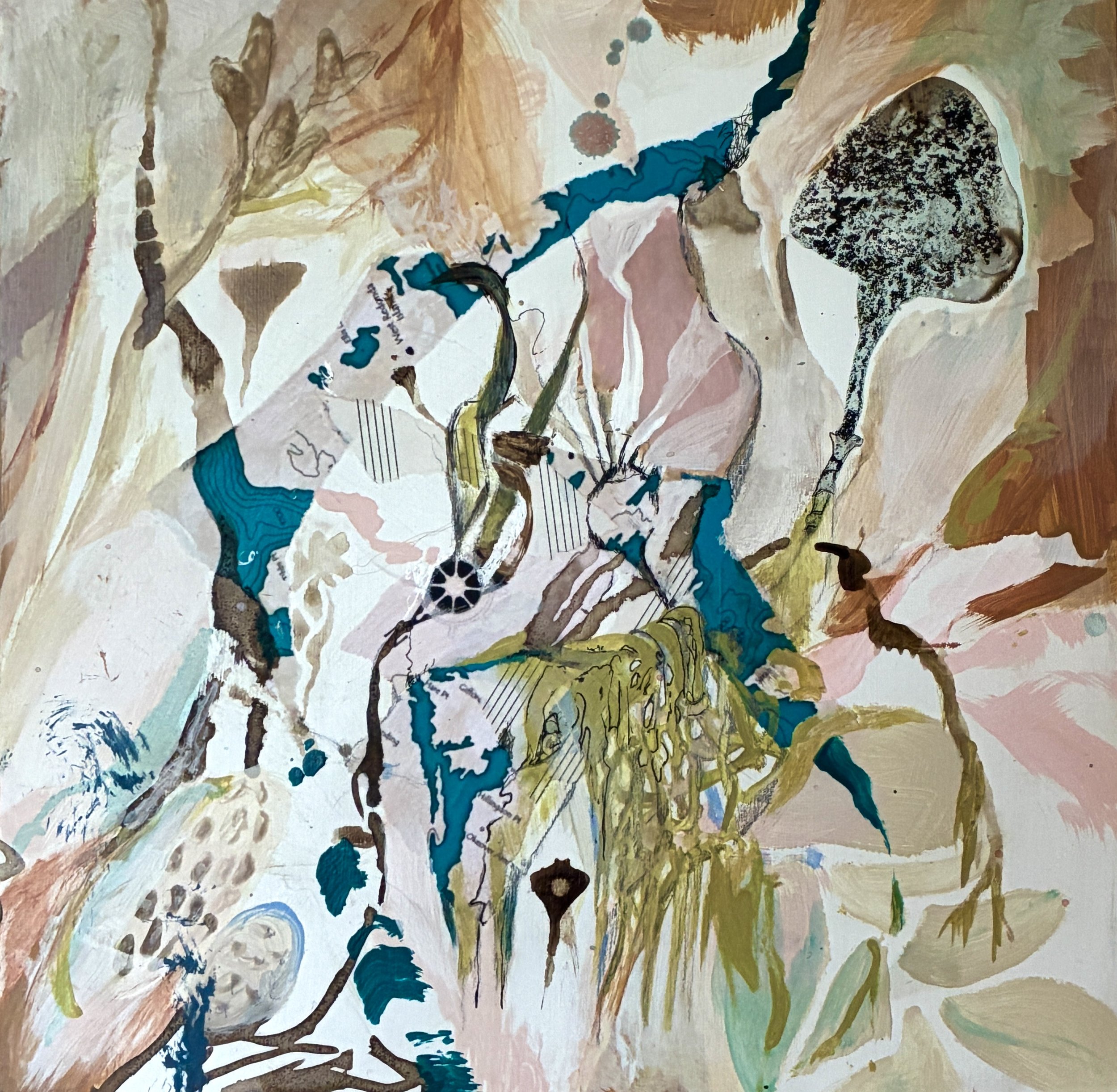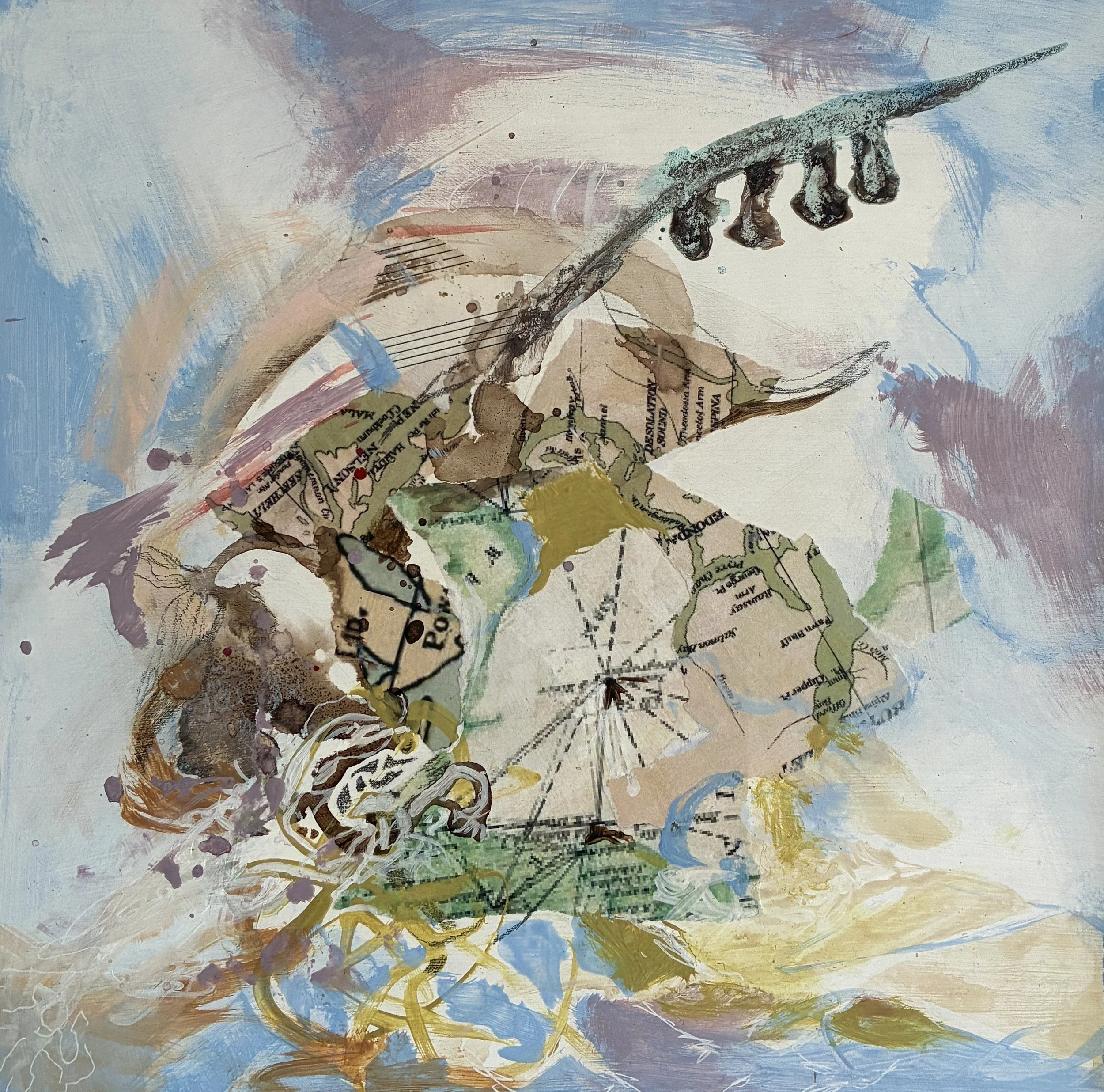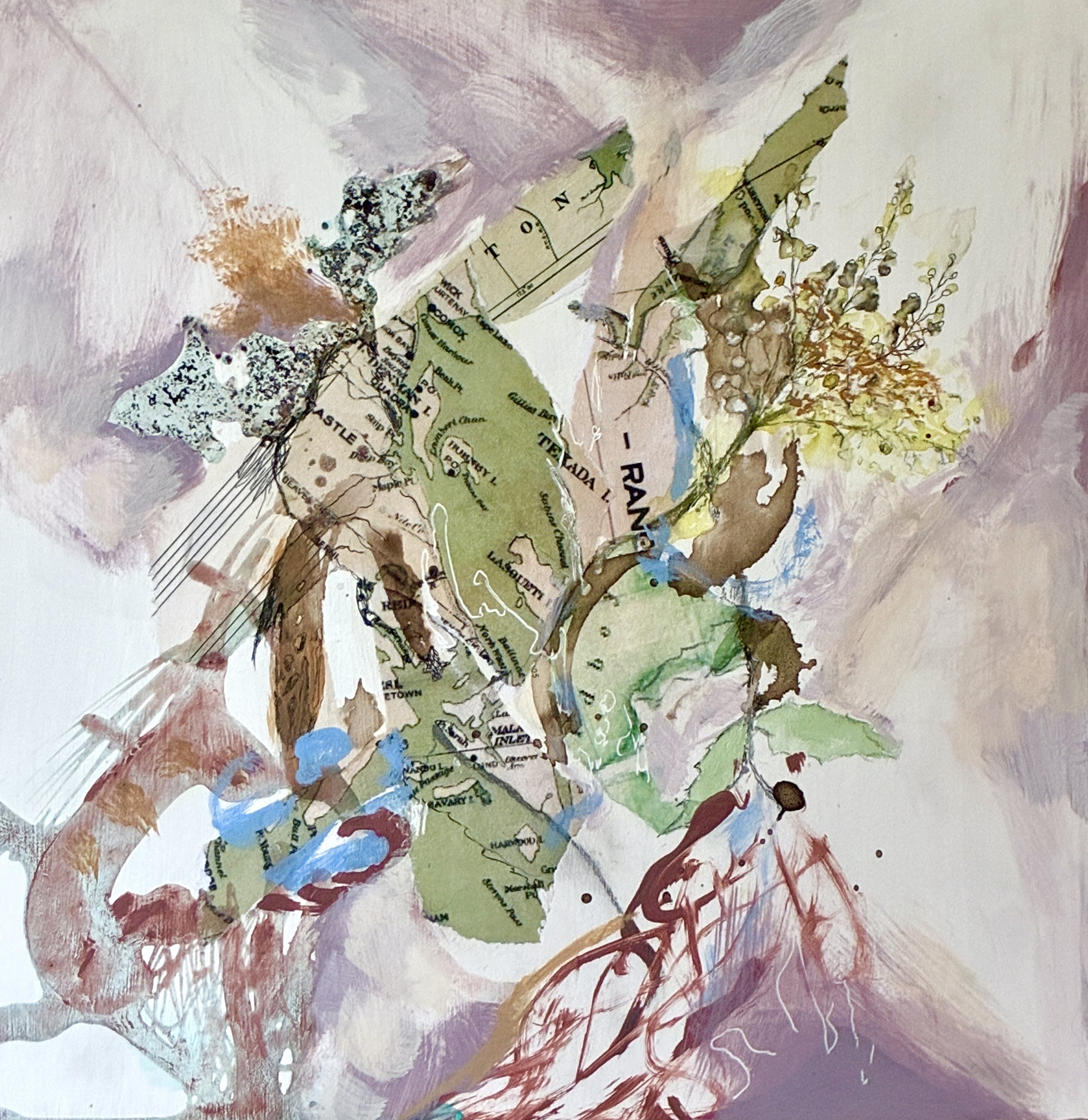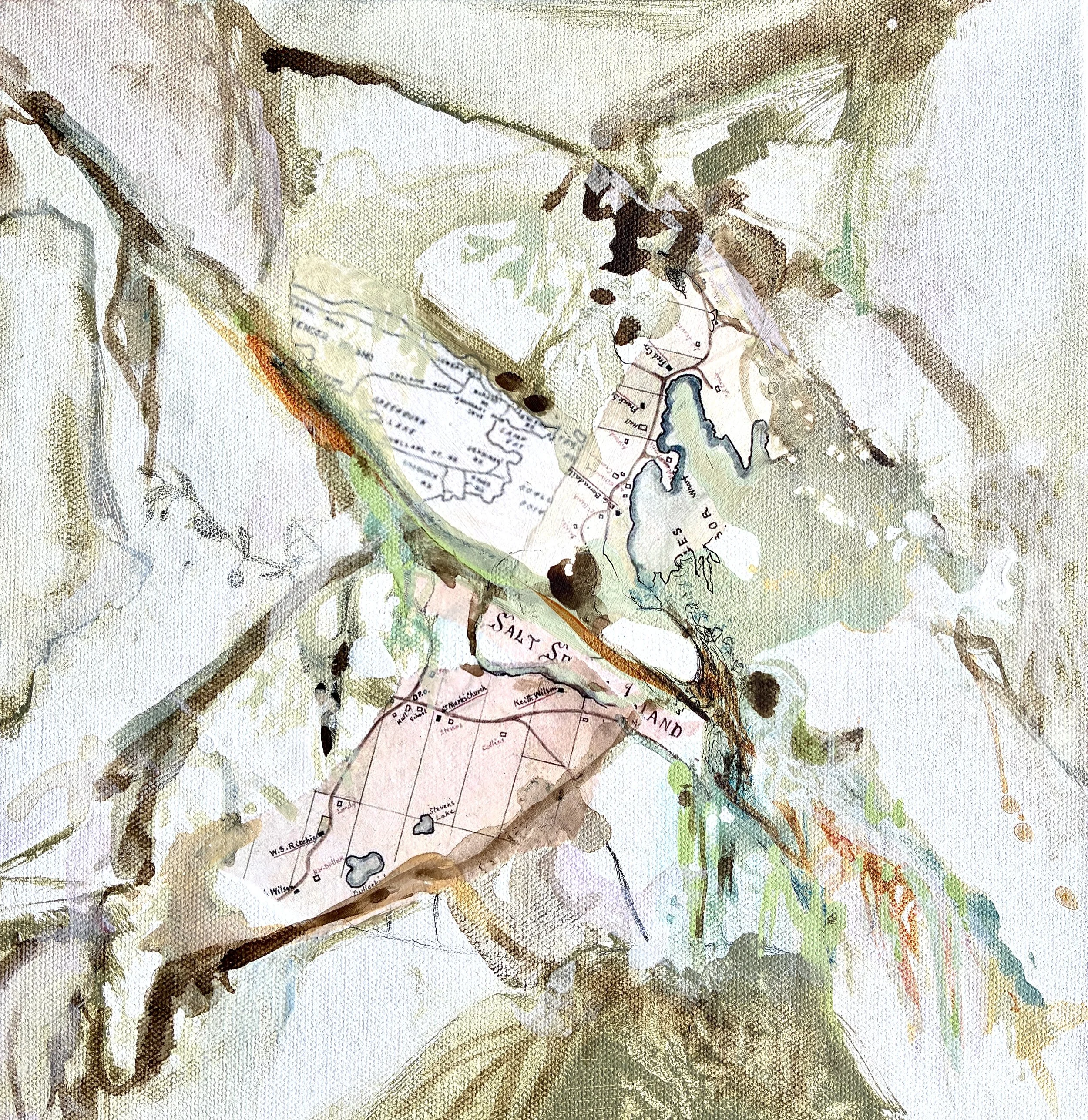 Paintings: The map paintings are visually restructured through collaged maps overlaid with mixed media. The paintings bring something new from the past by reordering information in new ways. They become saturated with both disparate and unified visual information in details such as flora, fauna, music notation, topography and mark making. Concepts around birth, decay, growth and rejuvenation provide cyclical rhythms that predominate the work. The paintings have a perception of moving lines, shifting spaces and disappearing and emerging forms. They are made with local area inks, reconstituted maps, graphite and pen.